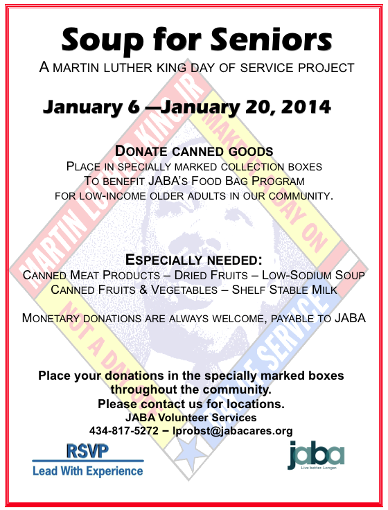 Jefferson Area Board for Aging will hold the Soup for Seniors canned food drive benefitting local, low-income older adults beginning Monday through Jan. 20. Donations of non-perishable foods can be dropped off at JABA’s office at 674 Hillsdale Drive, Care Advantage Plus, Branchlands, The Colonnades, The Independence, Jefferson Heights, Our Lady of Peace, Martha Jefferson House, Park View at South Pantops, the Senior Center, Twice is Nice, Westminster-Canterbury, Woods Edge, and the Walmart Distribution Center in Zion Crossroads. www.jabacares.org. 817-5272.