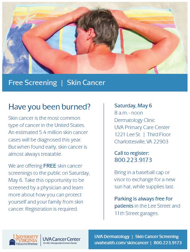 UVA is offering a free skin cancer screening on Saturday May 6, 8am-12pm. Call 1-800-223-9173 to schedule an appointment. See flyer below for more details: